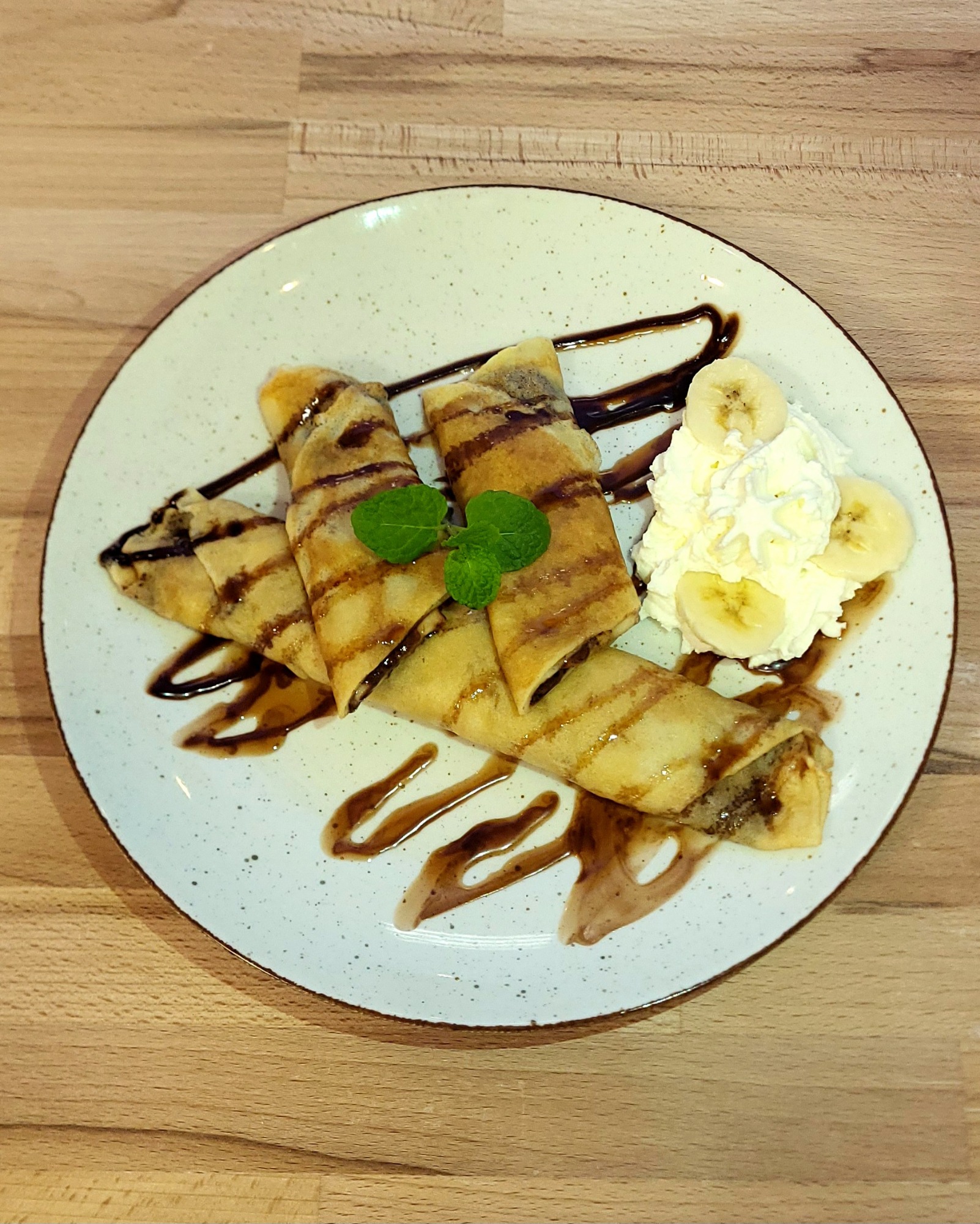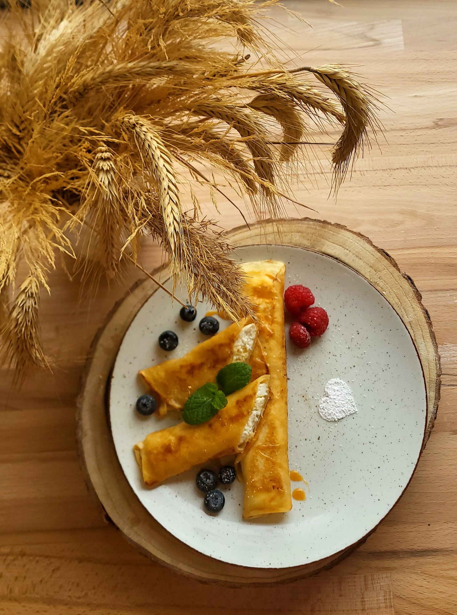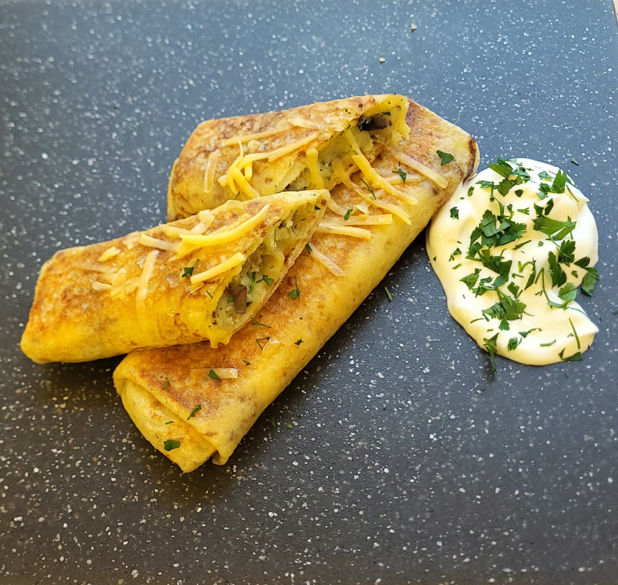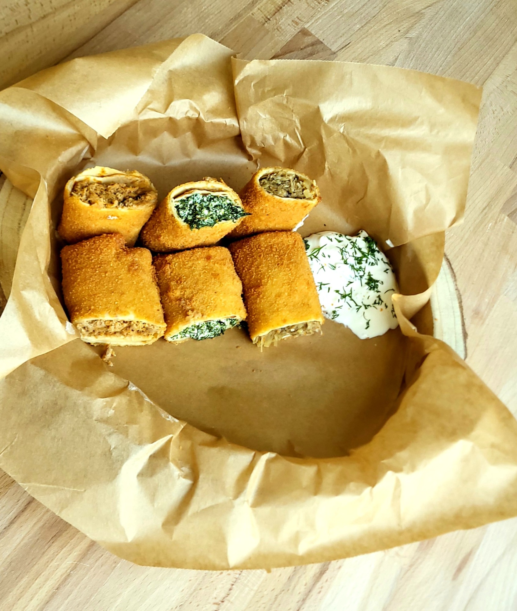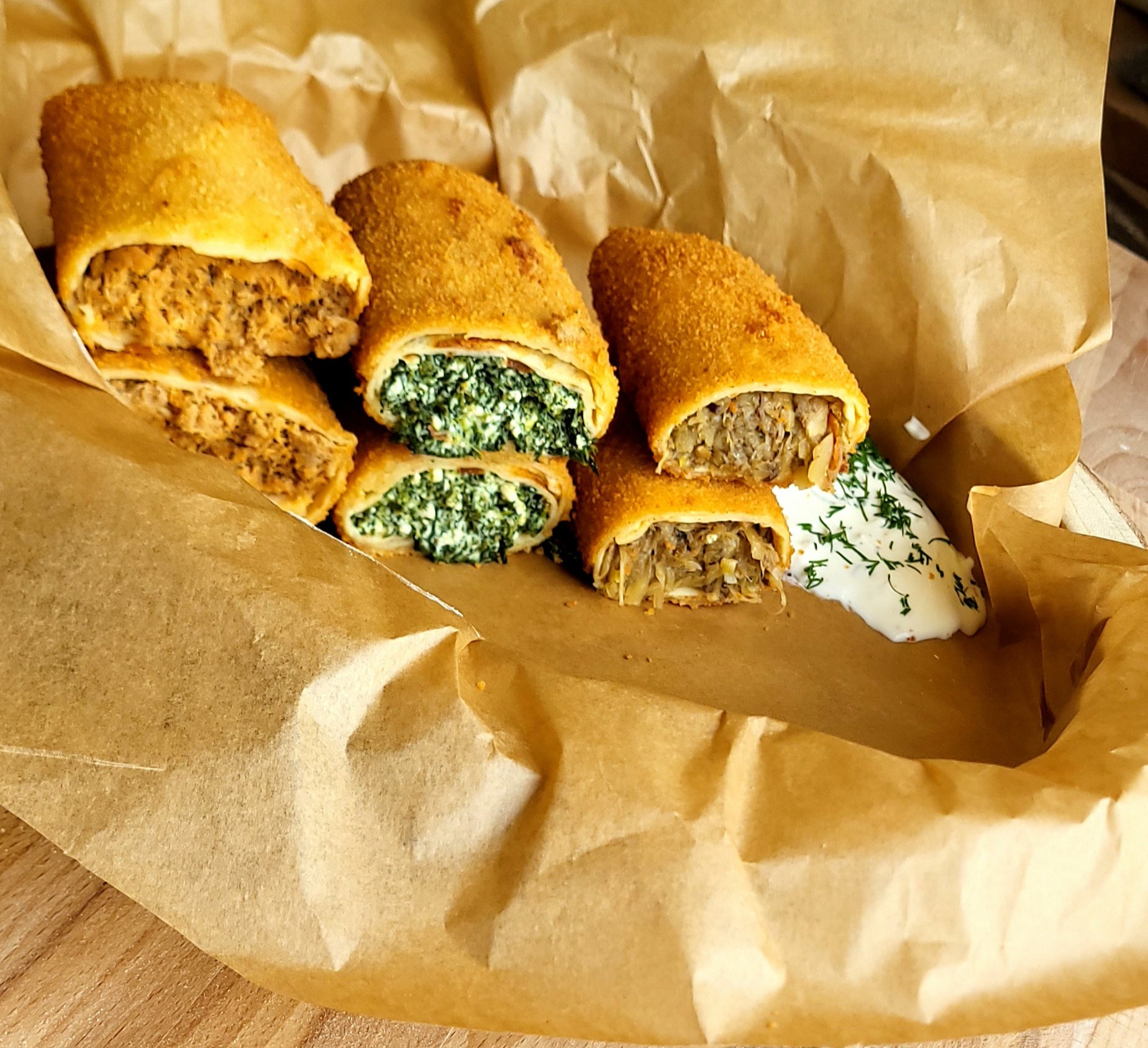 Cieniutkie złociste naleśniki owinięte w farsz ze smażonych na masełku pieczarek, gotowanych ziemniaków, karmelizowaną cebulą, ser cheddar, smażone w delikatnej chrupiącej paniercę z bułki tartej!