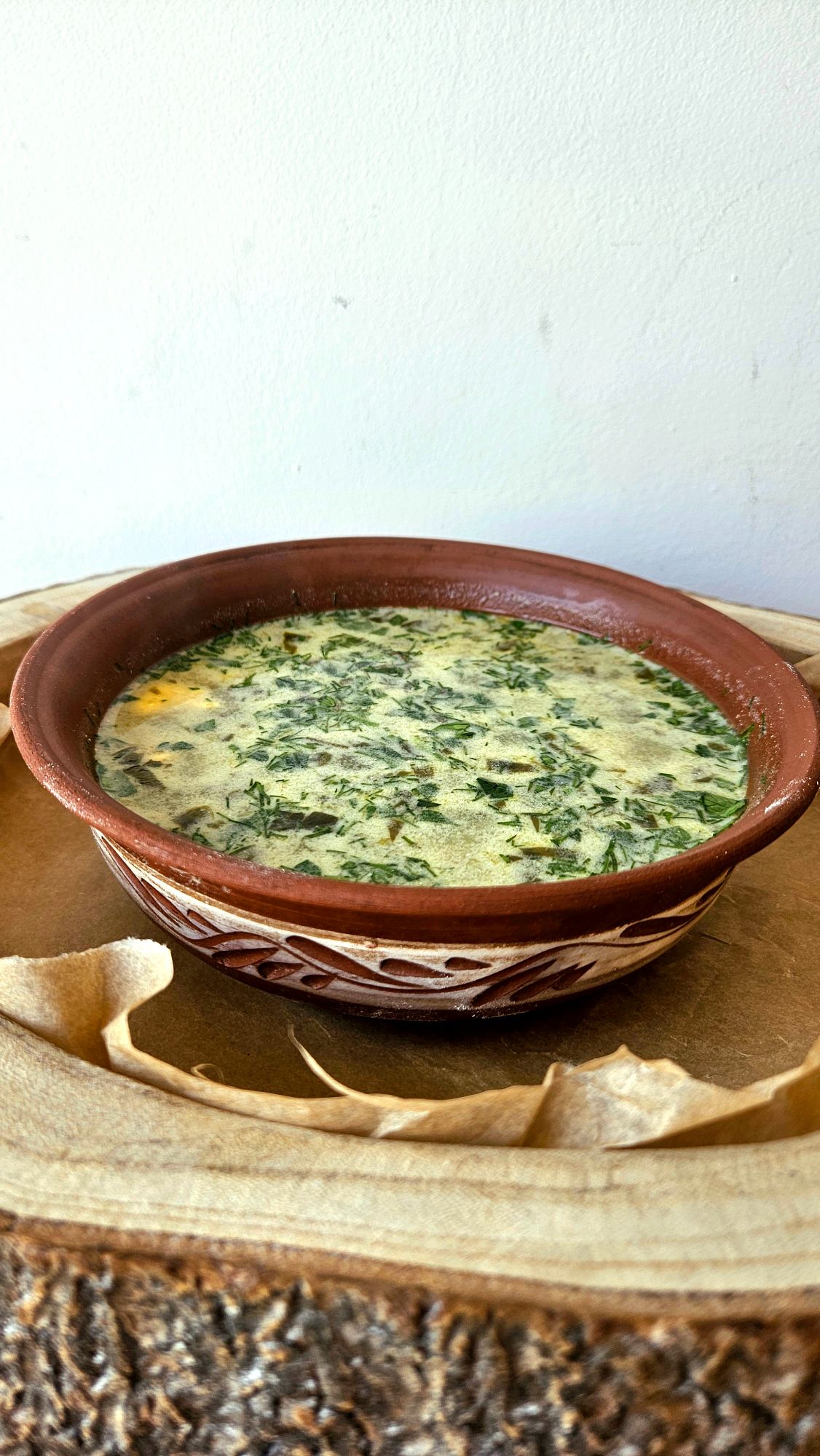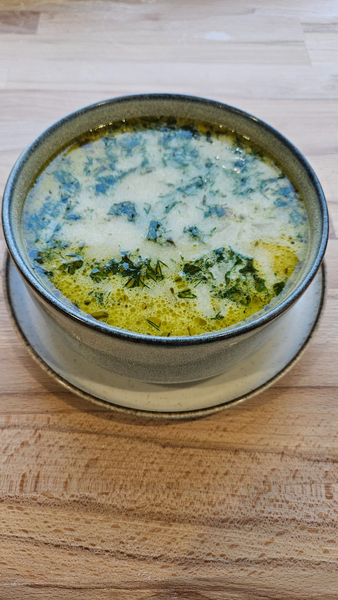 Bulion gotowany z kaczki i indyka, ze świeżych warzyw, podawany razem z 5 szt. pielmieniami, z mięsa wołowo-wieprzowego i świeżymi ziołami!