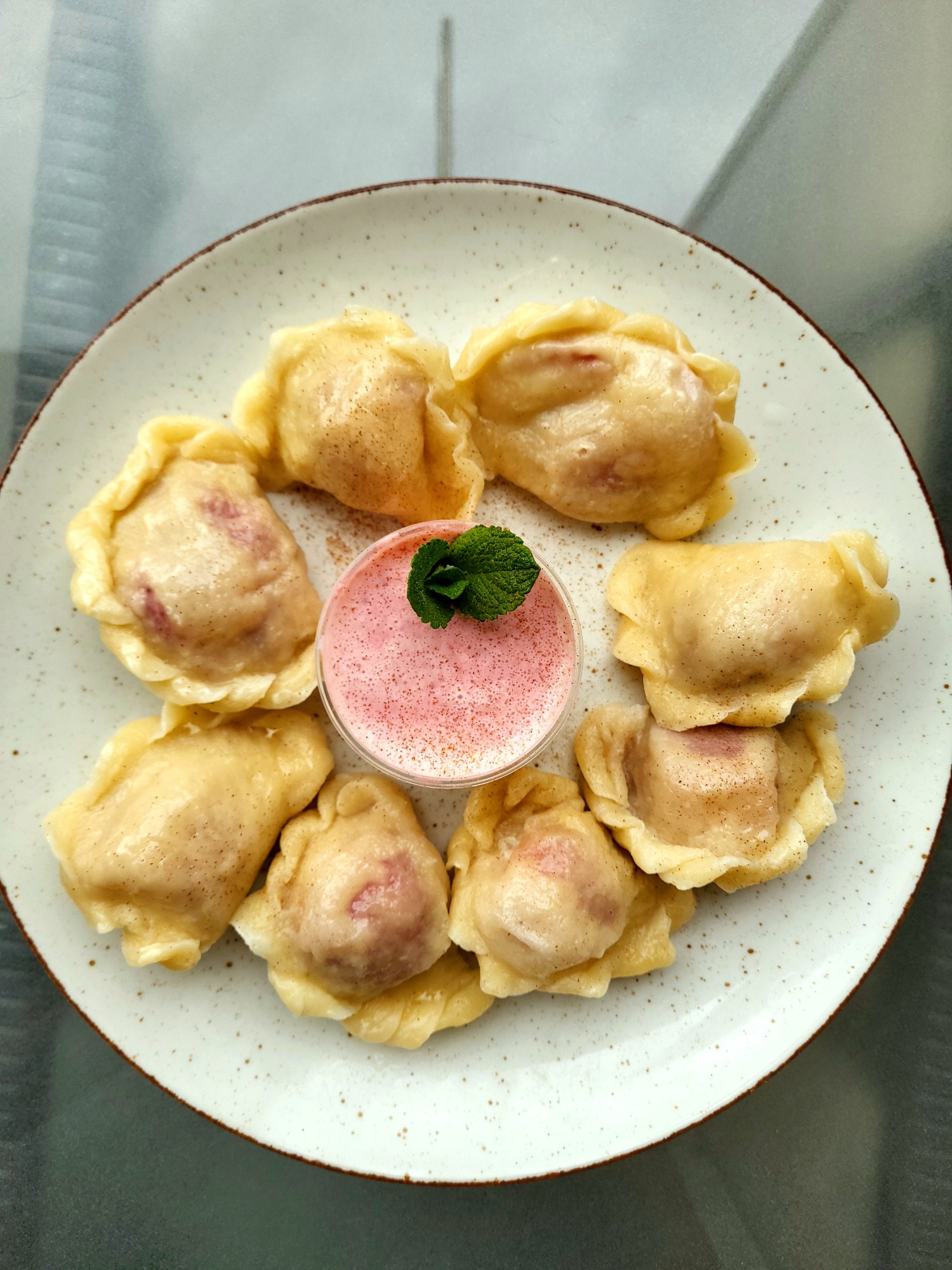 Osiem pękatych pierożków z mięciusieńkiego, ręcznie robionego ciasta, nadziewanych soczystym, pieczonym, idealnie doprawionym mięskiem z karkówki wieprzowej to porcja, która zadowoli nawet największych łakomczuchów. Dodatkiem do nich jest przepyszna, smażona na maśle cebulka. Radość na talerzu!